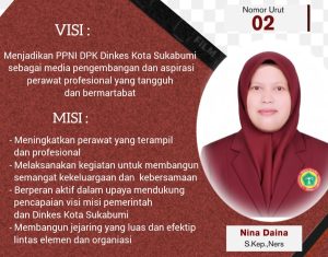 Visi Teh Nina adalah “Menjadikan PPNI DPK Dinkes Kota Sukabumi Sebagai Media Pengembangan dan Aspirasi Perawat Profesional yang Tangguh dan Bermartabat”