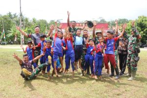 Sorak-sorai gembira terdengar setiap kali bola berhasil masuk ke gawang. Para siswa tampak antusias bermain bersama anggota TNI yang turut berlari, menendang bola, dan memberikan semangat kepada pemain cilik tersebut.